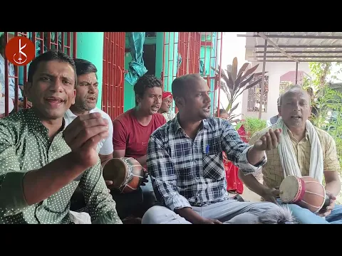 Women surrounding the cradle with a new born baby and singing with dhol majira